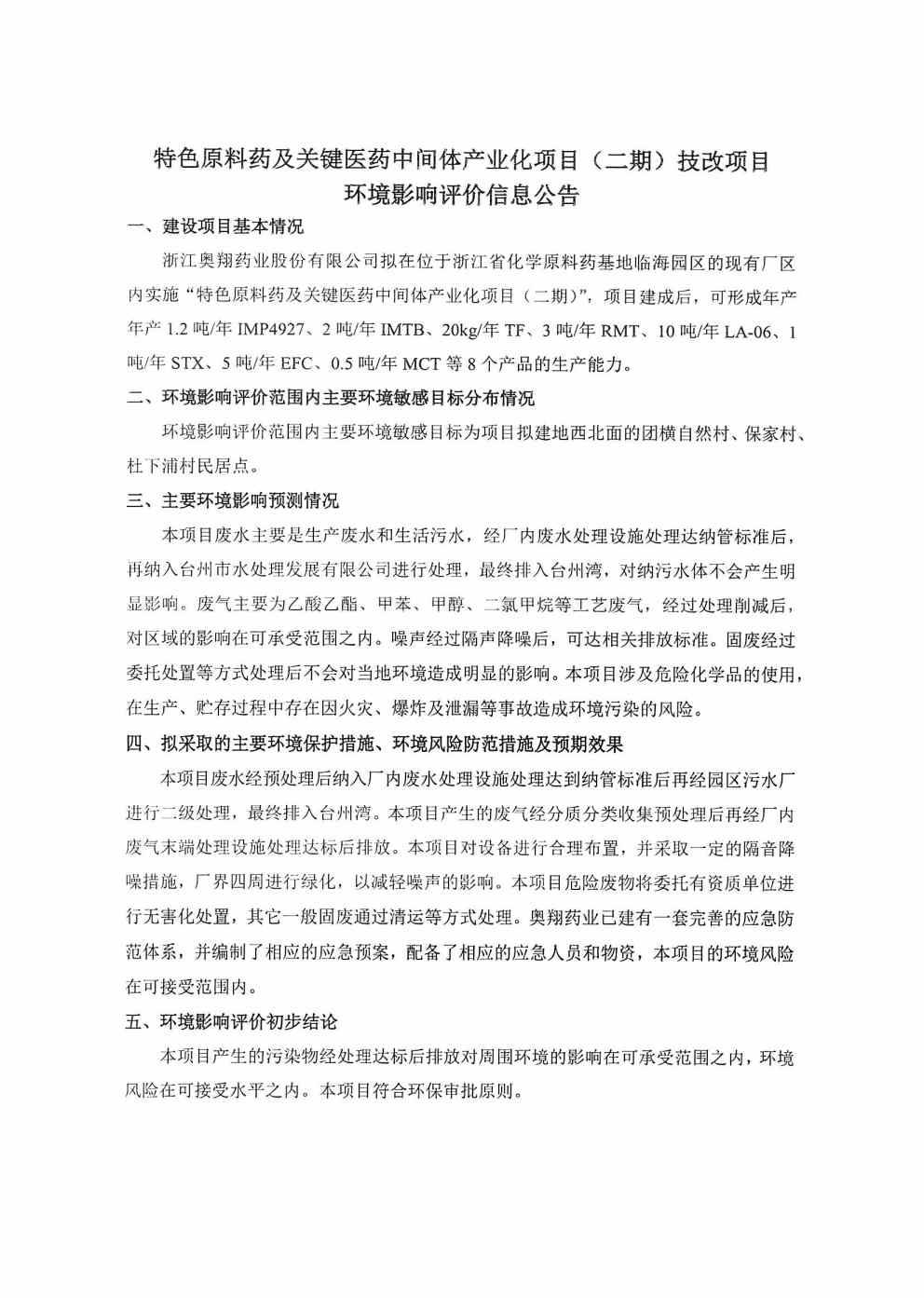 特色原料药及关键中间体产业项目二期技改环评信息公告